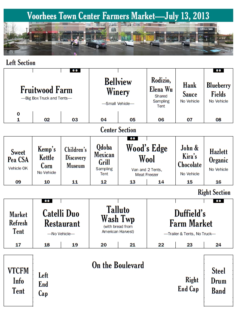 Sweet Pea CSA is back after too long away (and two weeks earlier than expected!) I’ve placed Alex between two vendors who do not park vehicles in the Market. I hope her neighbors will give her the room she needs for her little pickup. (There’s no room to spare.)