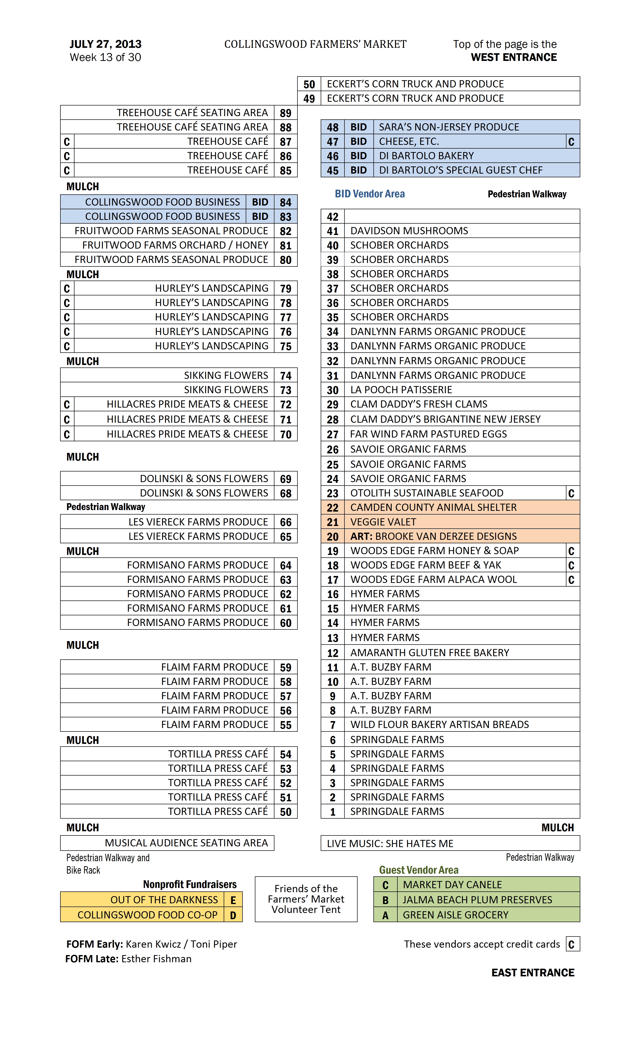 This week’s site plan uses a simple C for credit to indicate which vendors accept credit cards. Be sure to let me know if your position on credit cards changes.