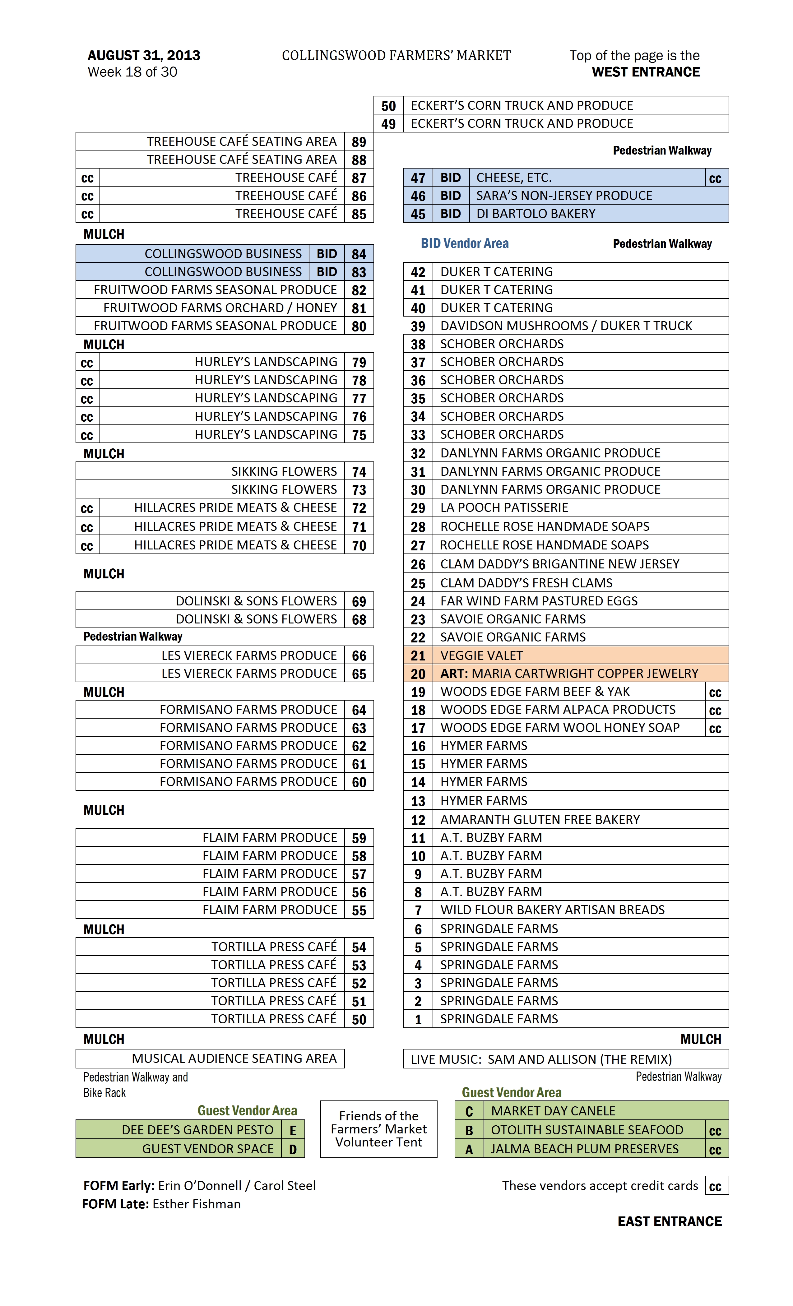 We’re back to our usual spaces following last week’s Craft Fair disruptions at the Irvin Avenue end of the Market. Most vendors will not notice the difference, but the Guest Vendors this week will return to the east end.