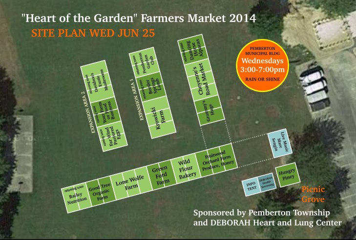 Today, WED JUN 25, marks the 4th week of the season for the “Heart of the Garden” Farmers’ Market, co-sponsored by the Township of Pemberton and the DEBORAH Heart and Lung Center. We’ve added a new feature, prepared refreshments from Pemberton’s own Hungry Piney.