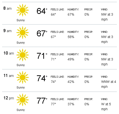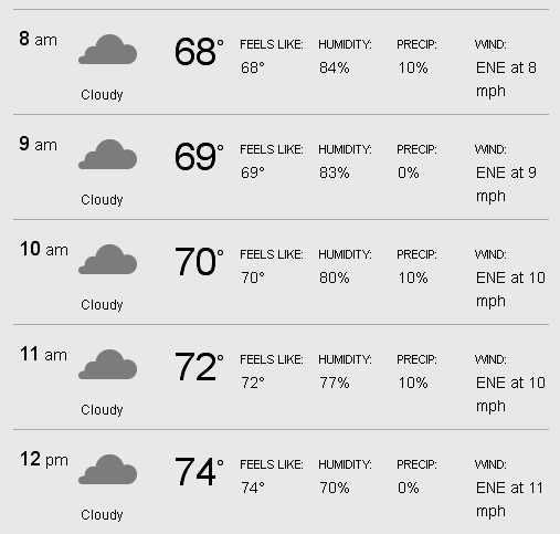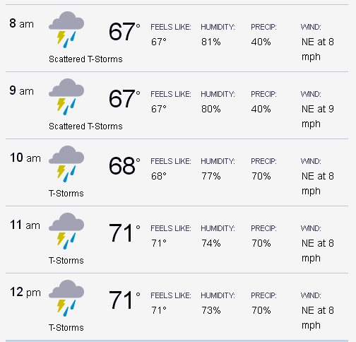 The current forecast is pretty awful. Cool, yes, but wickedly humid with the very high chance of rain, even morning thunderstorms. We’ve been lucky for years, so maybe we’ll be lucky again. But be prepared.