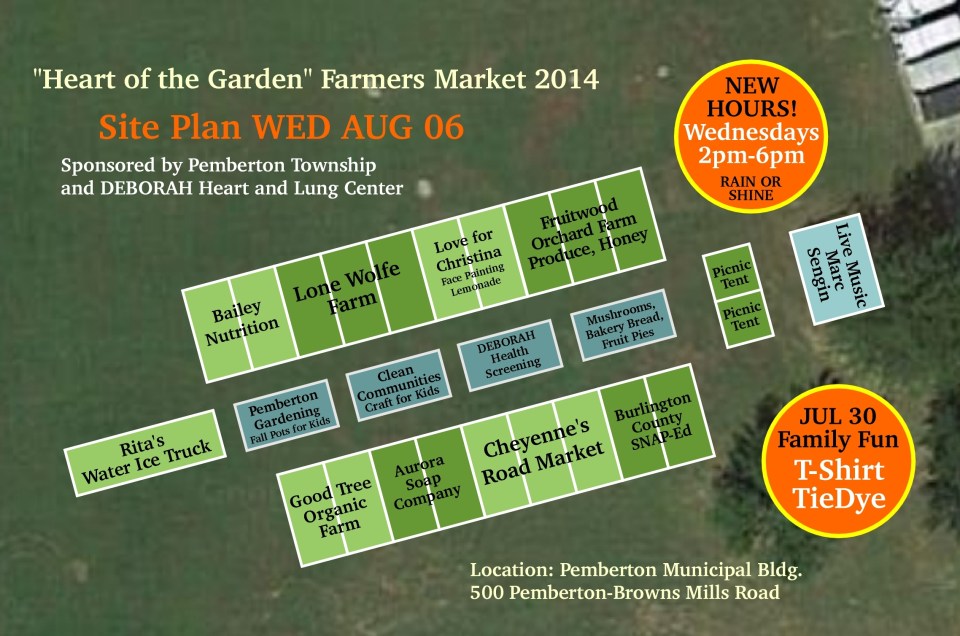 Today, WED AUG 06, marks the 10th week of the season for the “Heart of the Garden” Farmers’ Market, co-sponsored by the Township of Pemberton and the DEBORAH Heart and Lung Center.