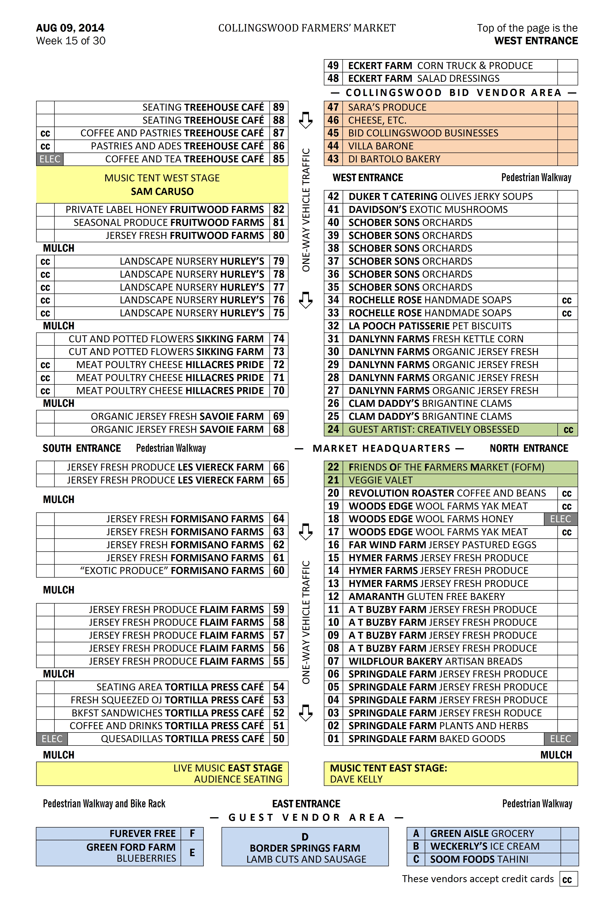 Here’s the Site Map. Note that there is no Guest Vendor area at the bottom. Irvin Avenue will be used for through traffic. Guest vendors and nonprofit fundraisers are positioned in internal Market spaces (85-89) (17-19) this week.