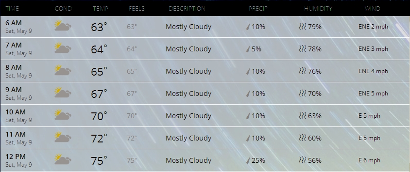 Cloudy but seasonably warm, temperature rising to the mid 70s by noon. Very light winds.