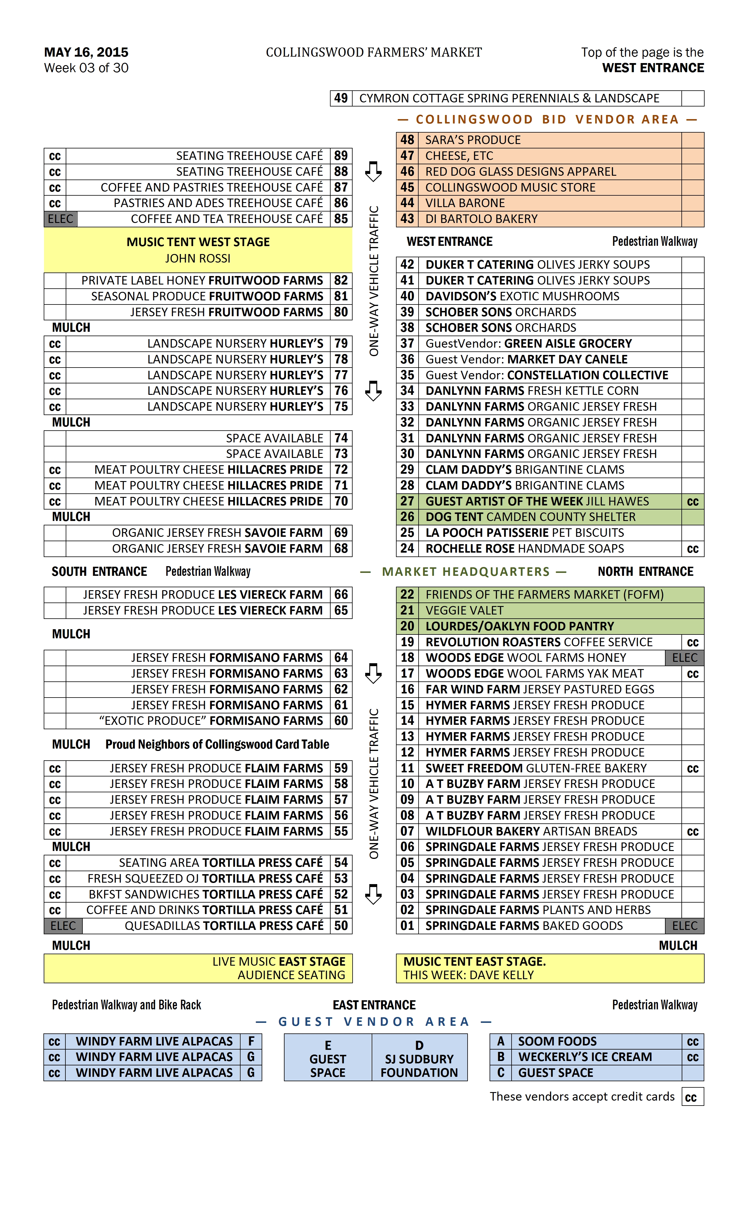 Changes will continue to occur throughout the season as vendors come and go and as we learn more about how neighbors interact. I remind you no spaces are ever guaranteed and require your cooperation if I have to move your location any given week. Thank you.