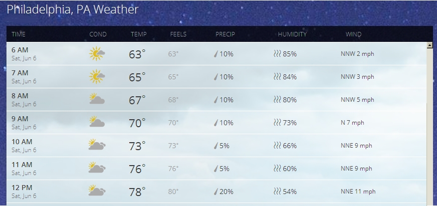 Looks like a beauty. Ordinary humidity for the season with little chance of rain until . . . well, it gets a little chancy around noon. Temperatures in the mid 70s. Light winds.