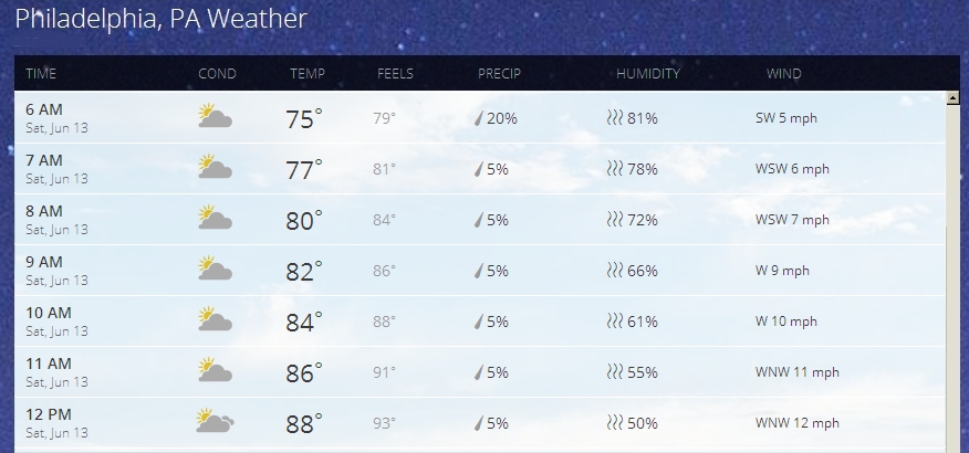 Looks like a beauty. Weather will be humid overnight Friday, but very little chance of rain Saturday, with temperatures climbing through the mid 70s to the upper 80s. SUMMER is HERE! Gets windy as the day progresses. Bring your tent weights.