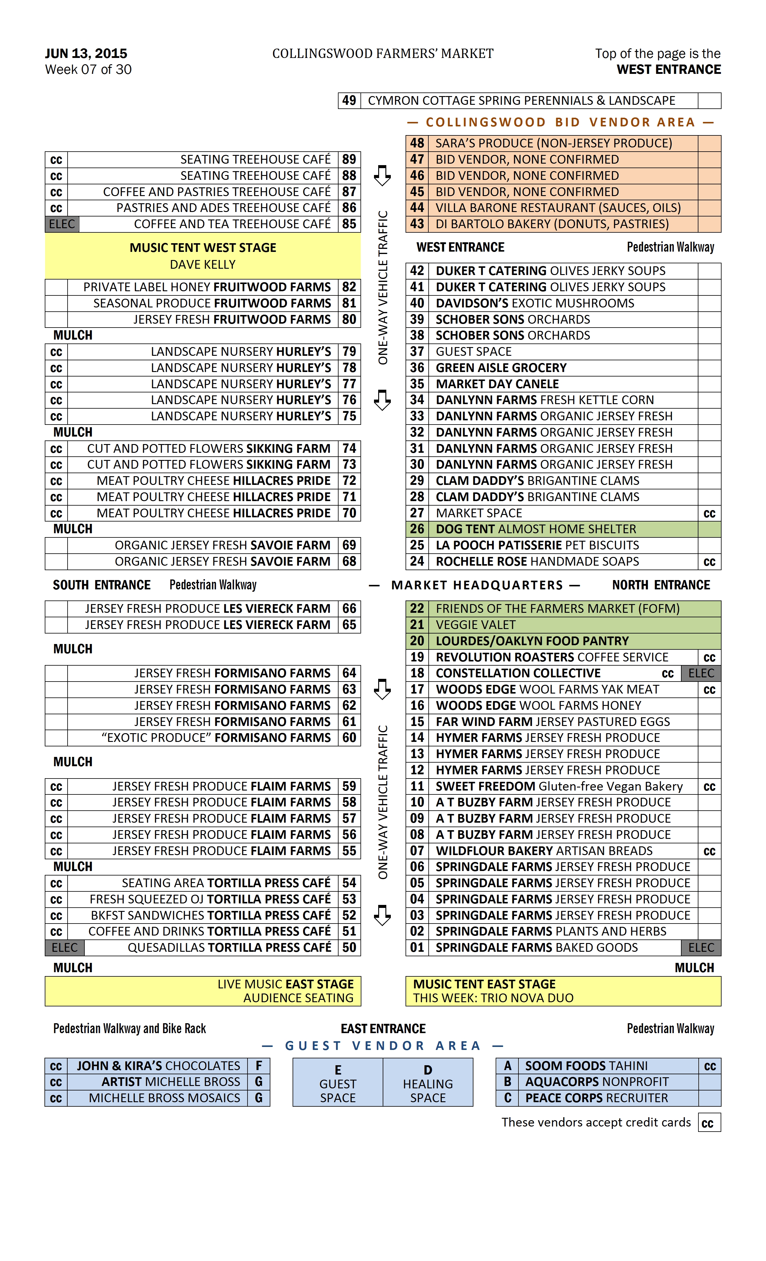 Changes will continue to occur throughout the season as vendors come and go and as we learn more about how neighbors interact. I remind you no spaces are ever guaranteed and require your cooperation if I have to move your location any given week. Thank you. David Hodges Market Director Home Office (856) 854-8385 Cell Phone for Market Saturdays (856) 979-6653 collsmkt@davidhodges.com
