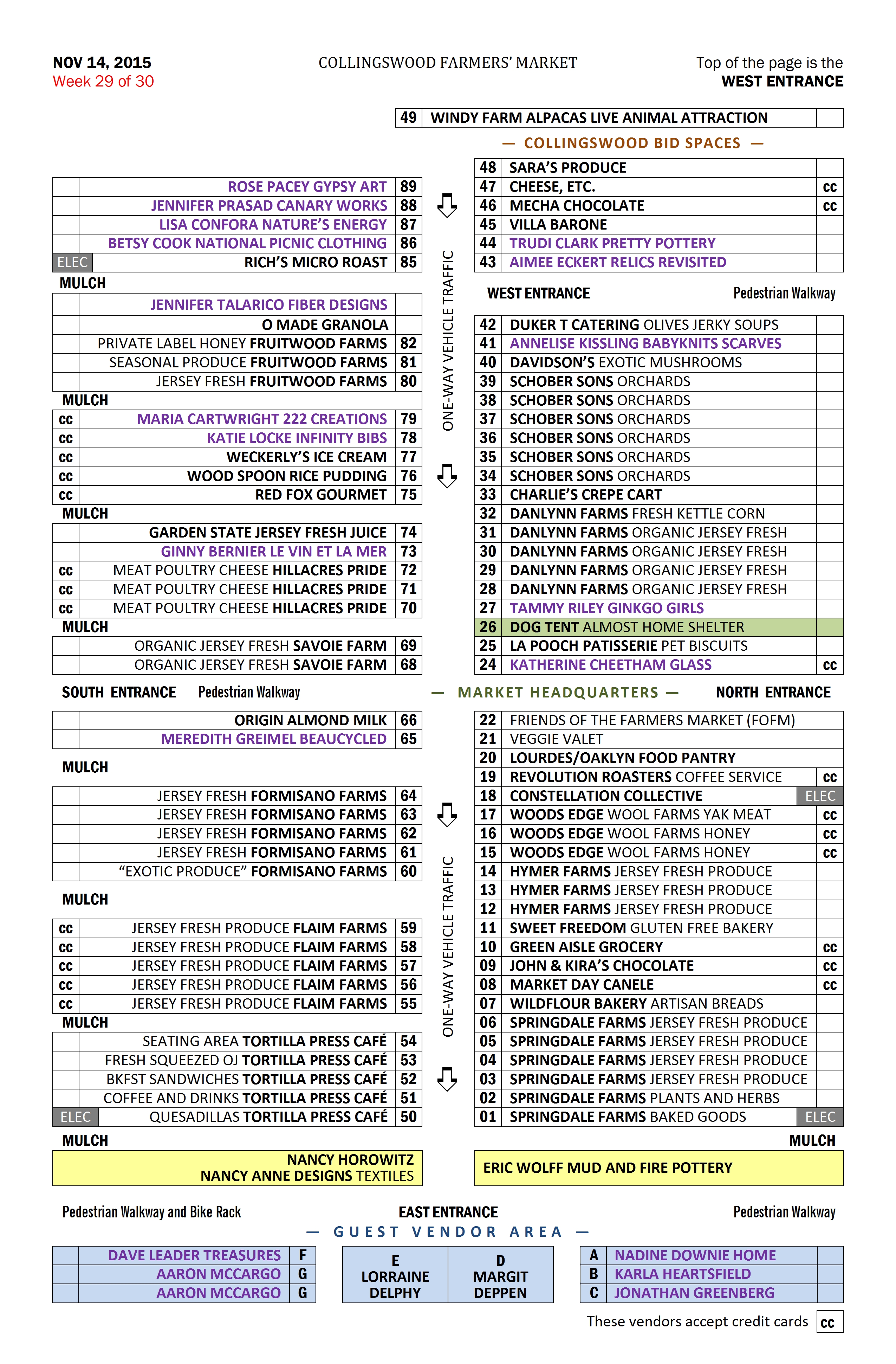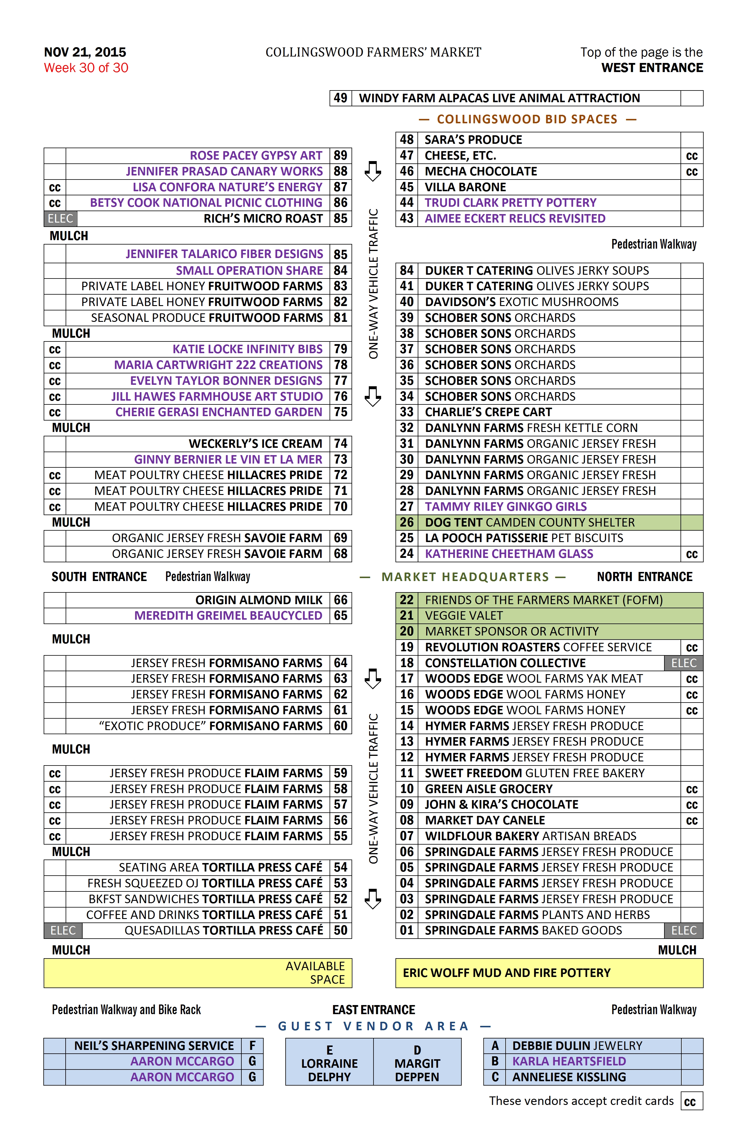 Changes will continue to occur throughout the season as vendors come and go and as we learn more about how neighbors interact. I remind you no spaces are ever guaranteed and require your cooperation if I have to move your location any given week.