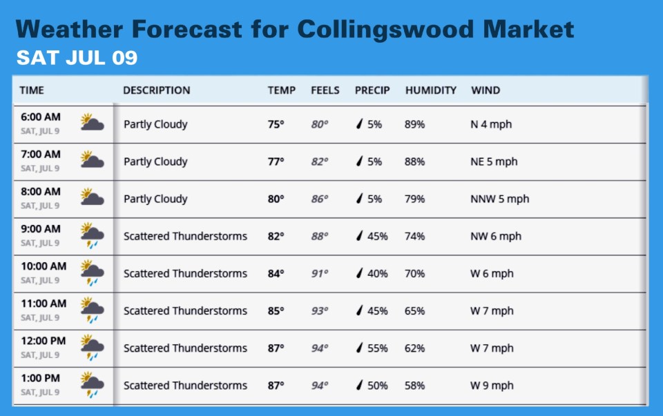 Scattered Thunderstorms. Okay. That could sound better. But remember the last time you needed rain and it fell on the neighboring town instead? I predict there will be rain in the Delaware Valley, but not at the Collingswood Market. Think dry.