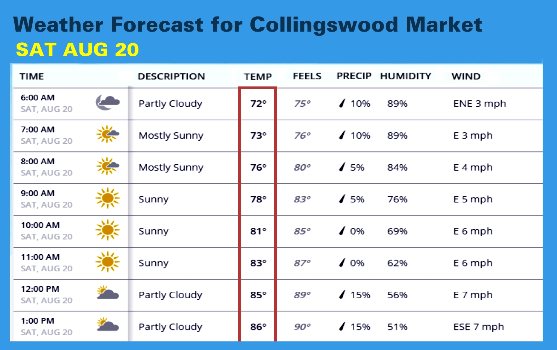 10 Degrees of Relief! Both our opening temperature of 72 and our closing temperature of 85 are 10 degrees cooler than Market conditions last Saturday. From cowbell to cowbell we’ll be more comfortable this week, with falling humidity throughout the day, very light breezes, and very little chance of rain. Ideal summer Market weather.