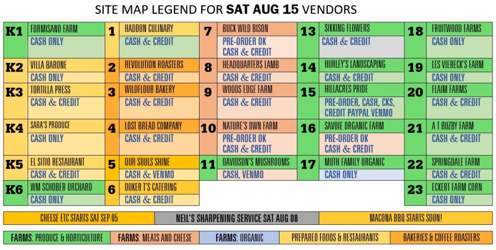 Cheese Etc and Macona BBQ are not with us yet, but we have room for them when they join us. SAT AUG 08, we’ll have our first visit from Neil’s Sharpening Service.