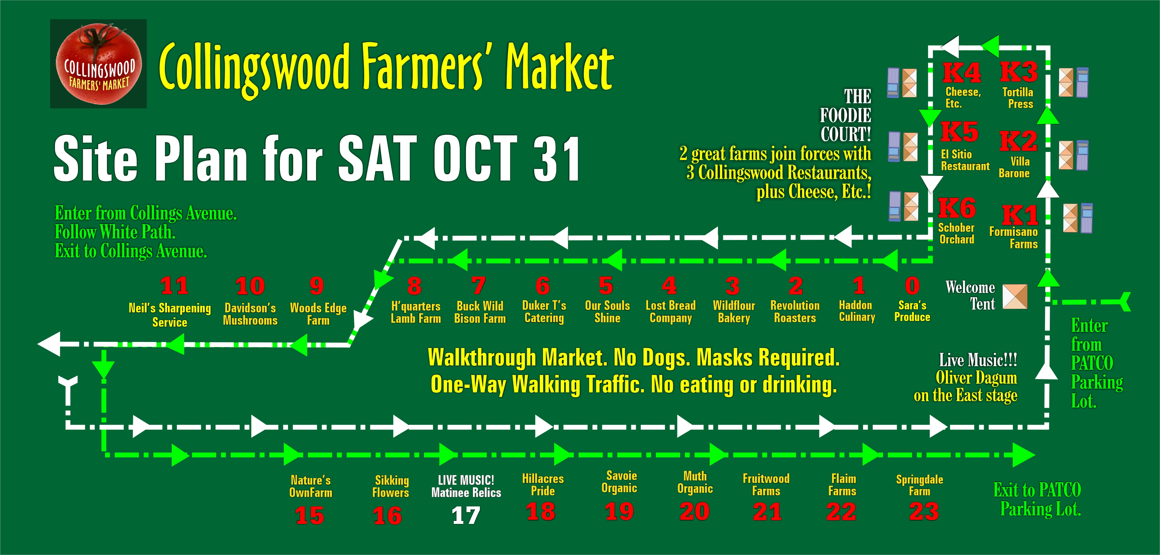 Changes will continue to occur throughout the season as vendors come and go and as we learn more about how neighbors interact. I remind you no spaces are ever guaranteed and require your cooperation if I have to move your location any given week.