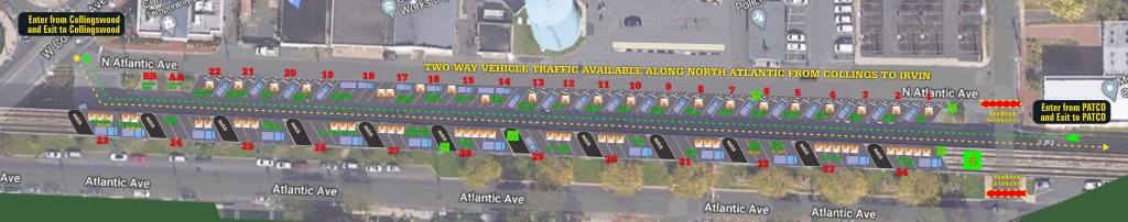- KEEP INSIDE YOUR SPACE (PATCO SIDE). Vendors under PATCO will park their vehicles parallel to the curb (see the site plan) and keep their tents and tables COMPLETELY INSIDE the painted parking space lines.