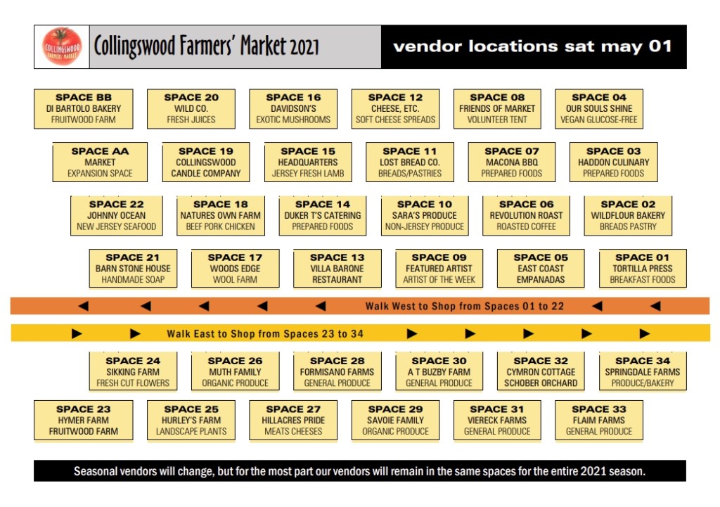This chart will be distributed to shoppers at the Market to help them find you. Except as noted, these locations for full-season vendors will likely be the same week after week. Obviously, part-time participants may find themselves in different spots on different weeks.