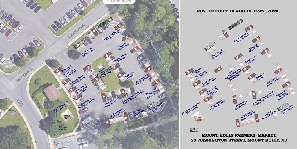 Look for David to guide you to your location. You may park your vehicle directly adjacent to your tent location and leave it in the Market for the evening. Don’t set up until he has confirmed your spot. We have plenty of space in the parking lot for our own vendor vehicles, so EVERYONE can drive in and leave trucks, vans, trailers in your own retail space! No customers will drive into the Market.