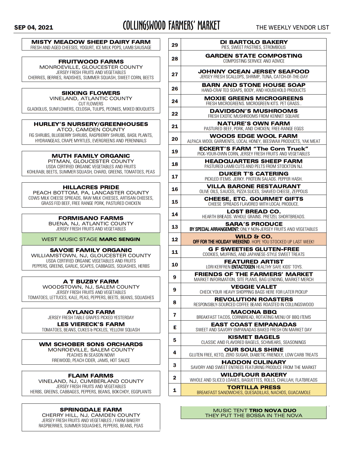 Changes will continue to occur throughout the season as vendors come and go and as we learn more about how neighbors interact. I remind you no spaces are ever guaranteed and require your cooperation if I have to move your location any given week.