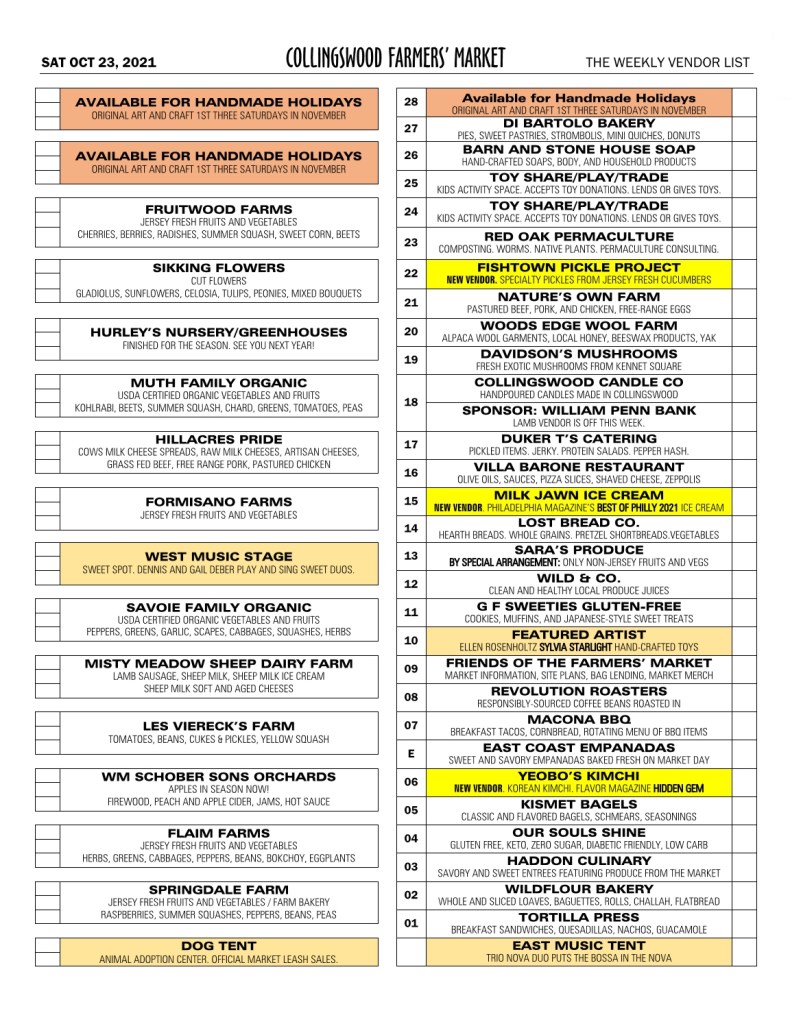Changes will continue to occur throughout the season as vendors come and go and as we learn more about how neighbors interact. I remind you no spaces are ever guaranteed and require your cooperation if I have to move your location any given week.