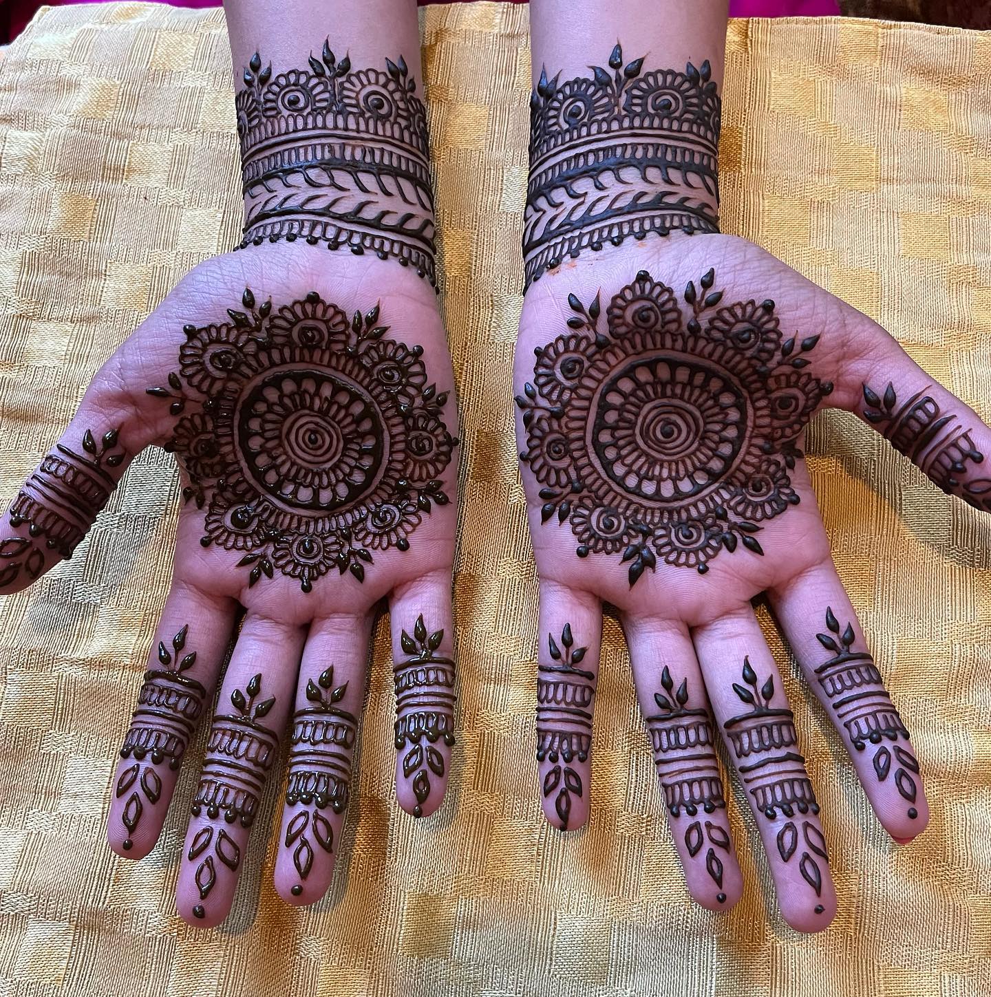 Varsha Patel makes henna art on the body, on canvas, on objects for home décor. She says: “All natural henna tattoo artist and free hand artwork and home décor. Artwork on wine bottles, glasses, canvases, wind chimes, shells , wood burning etc.”