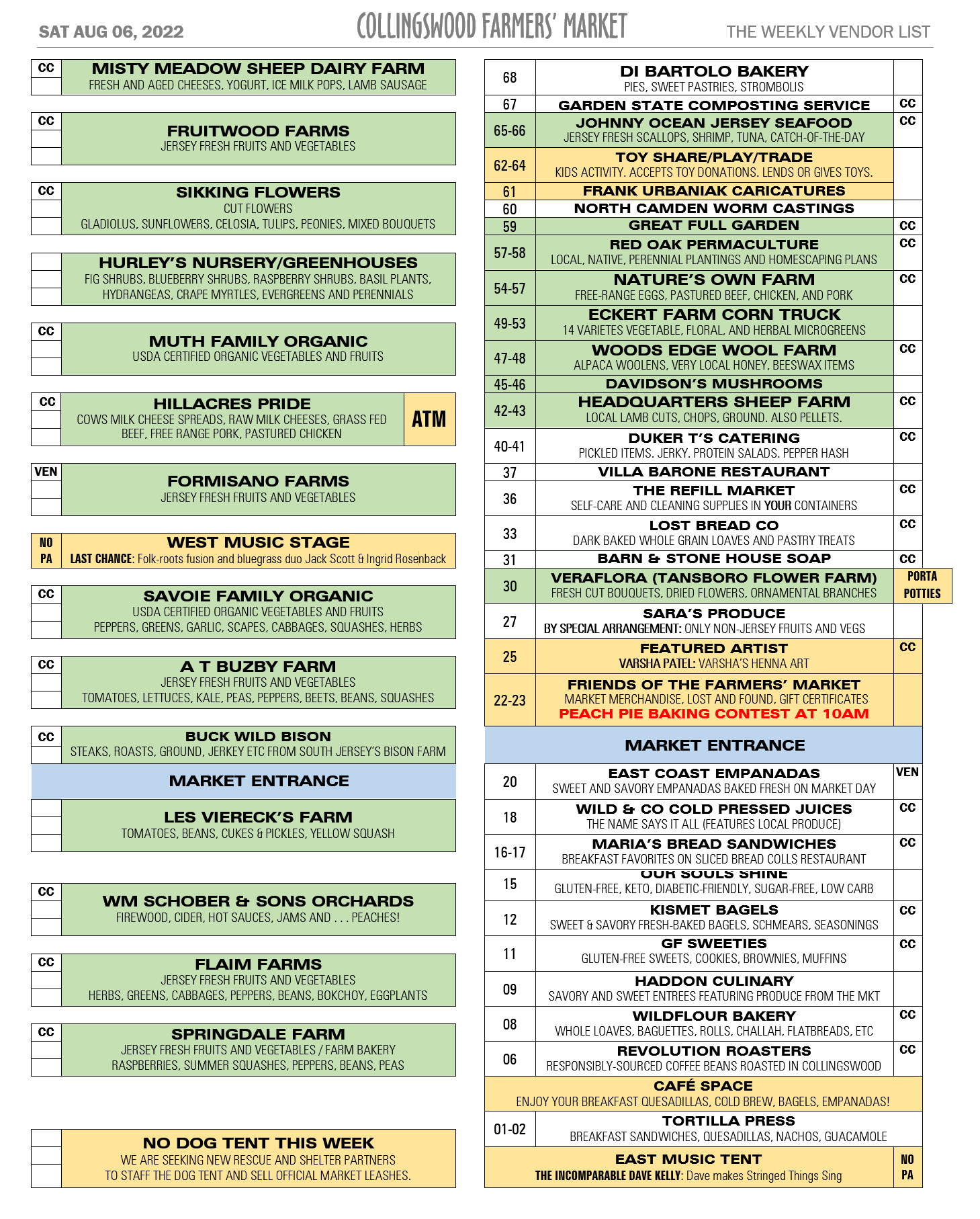 Changes will continue to occur throughout the season as vendors come and go and as we learn more about how neighbors interact. I remind you no spaces are ever guaranteed and require your cooperation if I have to move your location any given week.